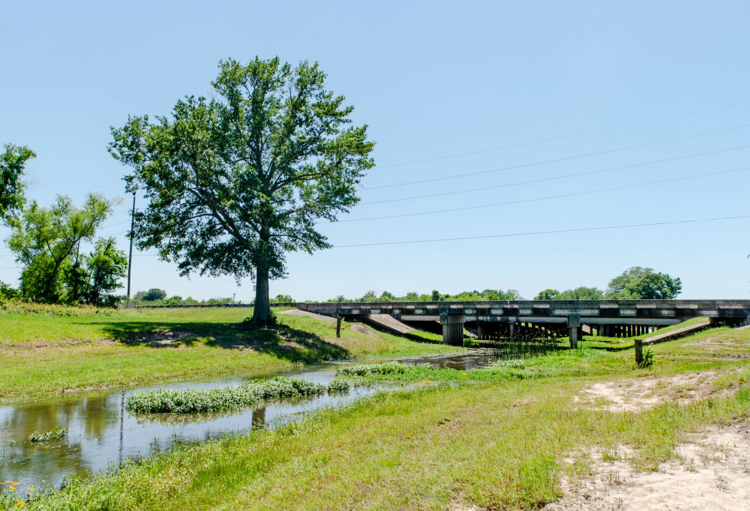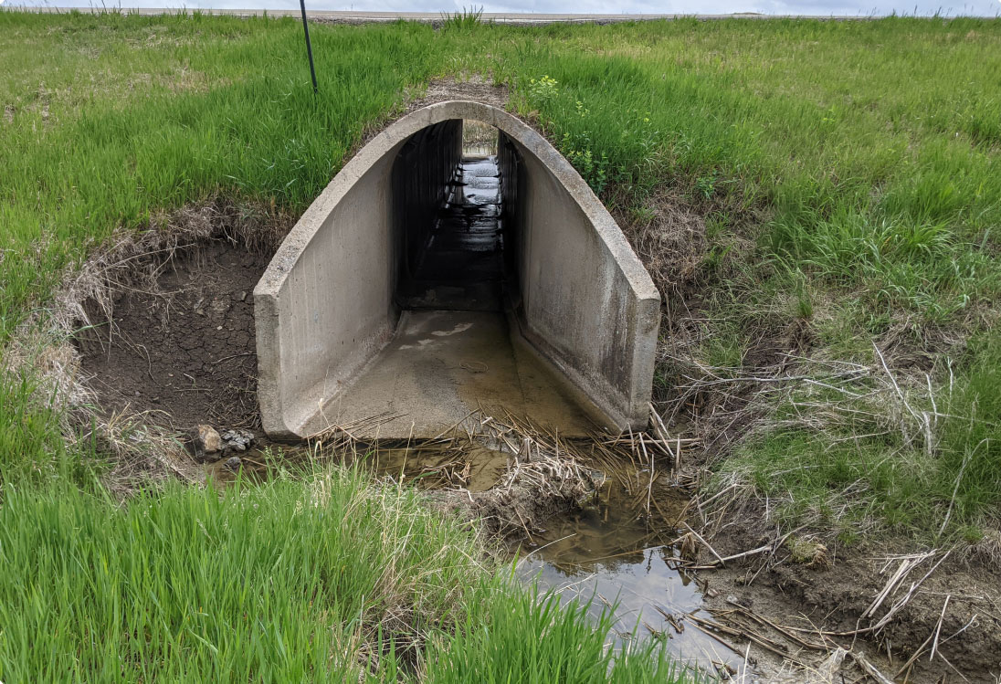 A natural or constructed channel that moves water overland to a nearby creek or river.
