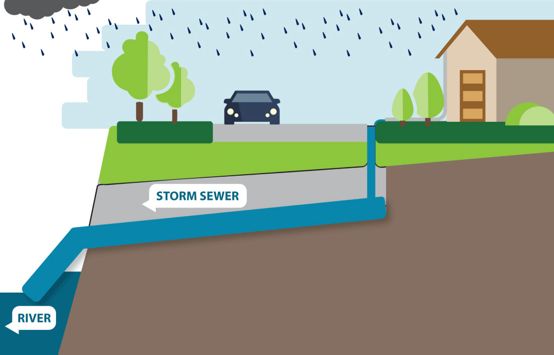 Stormwater is the runoff from rain or snowmelt that is not absorbed by soil. Stormwater can flow directly to streams and lakes, or it may be transported by municipal storm sewer pipe systems. Unlike sanitary sewers, storm sewers do not lead to treatment plants but eventually drain into streams and lakes.